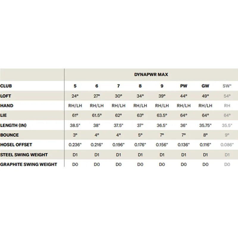 The Wilson DYNAPWR Max Iron Set is engineered for golfers seeking enhanced forgiveness, higher launch, and ease of play. Positioned as the most forgiving and highest-launching irons in Wilson's lineup, these clubs are tailored for players who desire extra assistance in their game.